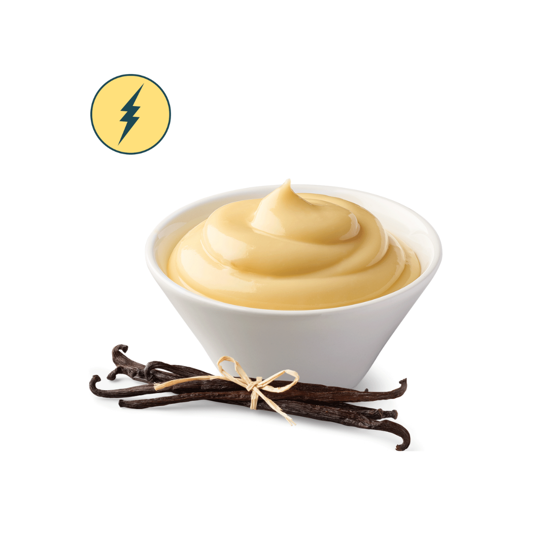 Dessert al cucchiaio al gusto di vaniglia, con edulcoranti, senza glutine. Alimento Fast.