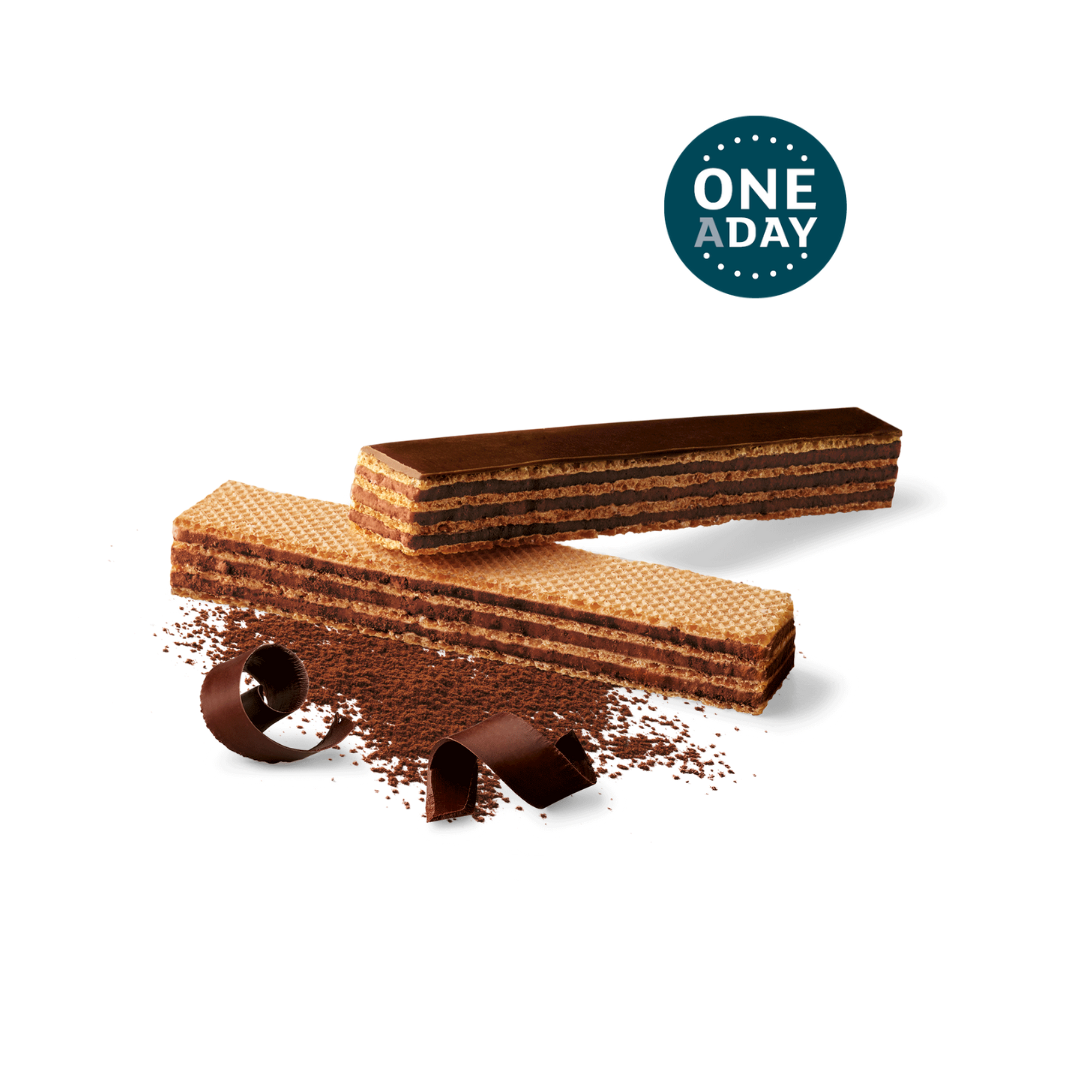 Wafer con edulcorante, zucchero e farcitura al gusto di cioccolato fondente e copertura al gusto di cioccolato al latte. Alimento ONE A DAY: massimo un prodotto al giorno di questa categoria.